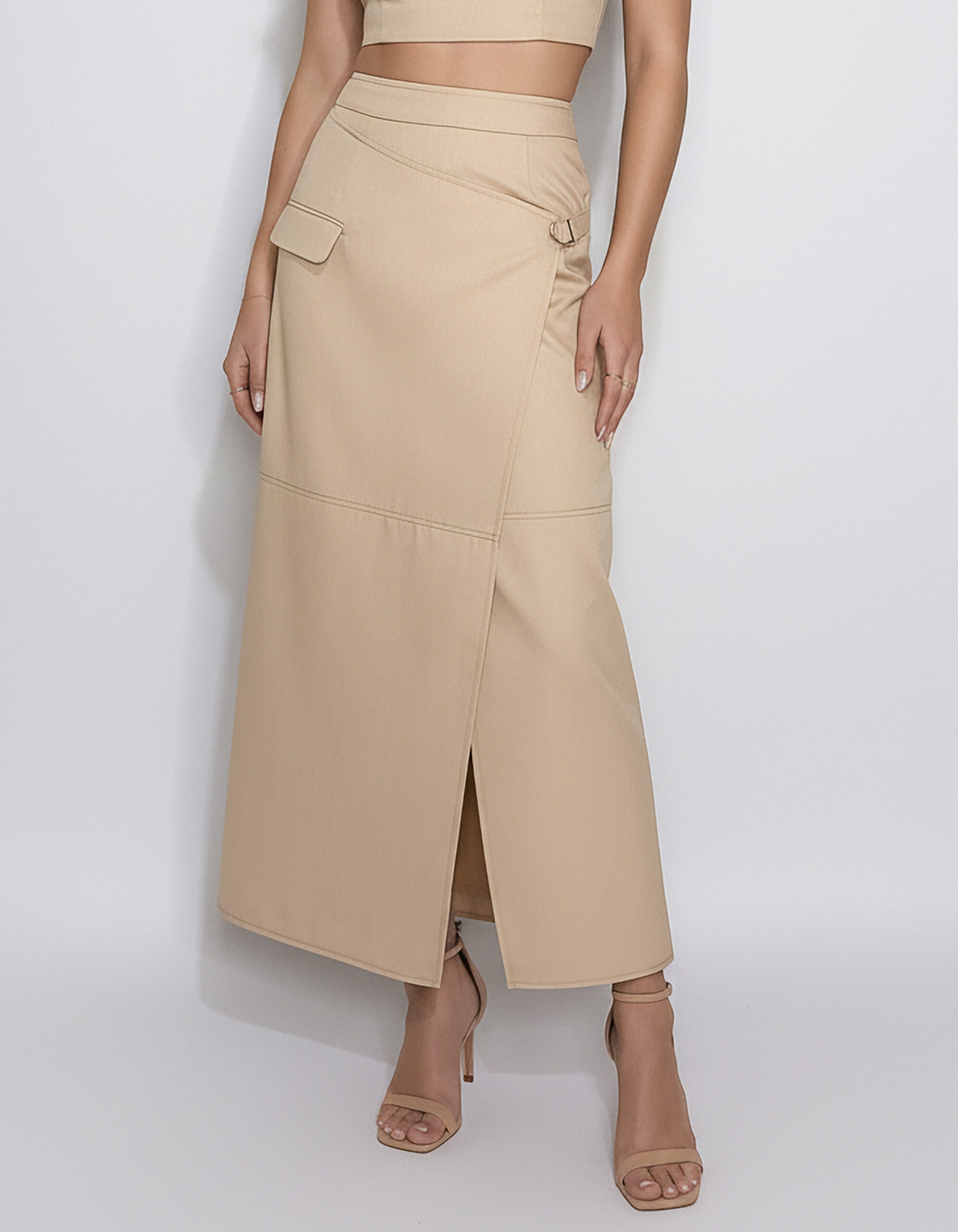 The Axis Skirt redefines your wardrobe essentials with its perfect blend of structure and fluidity. Crafted in a warm sandstone beige canvas, this skirt molds softly to your body while retaining its form, delivering effortless sophistication. Its unique design features angular paneling, a front slit, and an asymmetrical pocket detail, blending utilitarian influences with the precision of sacred geometry to create a piece that’s both modern and timeless.