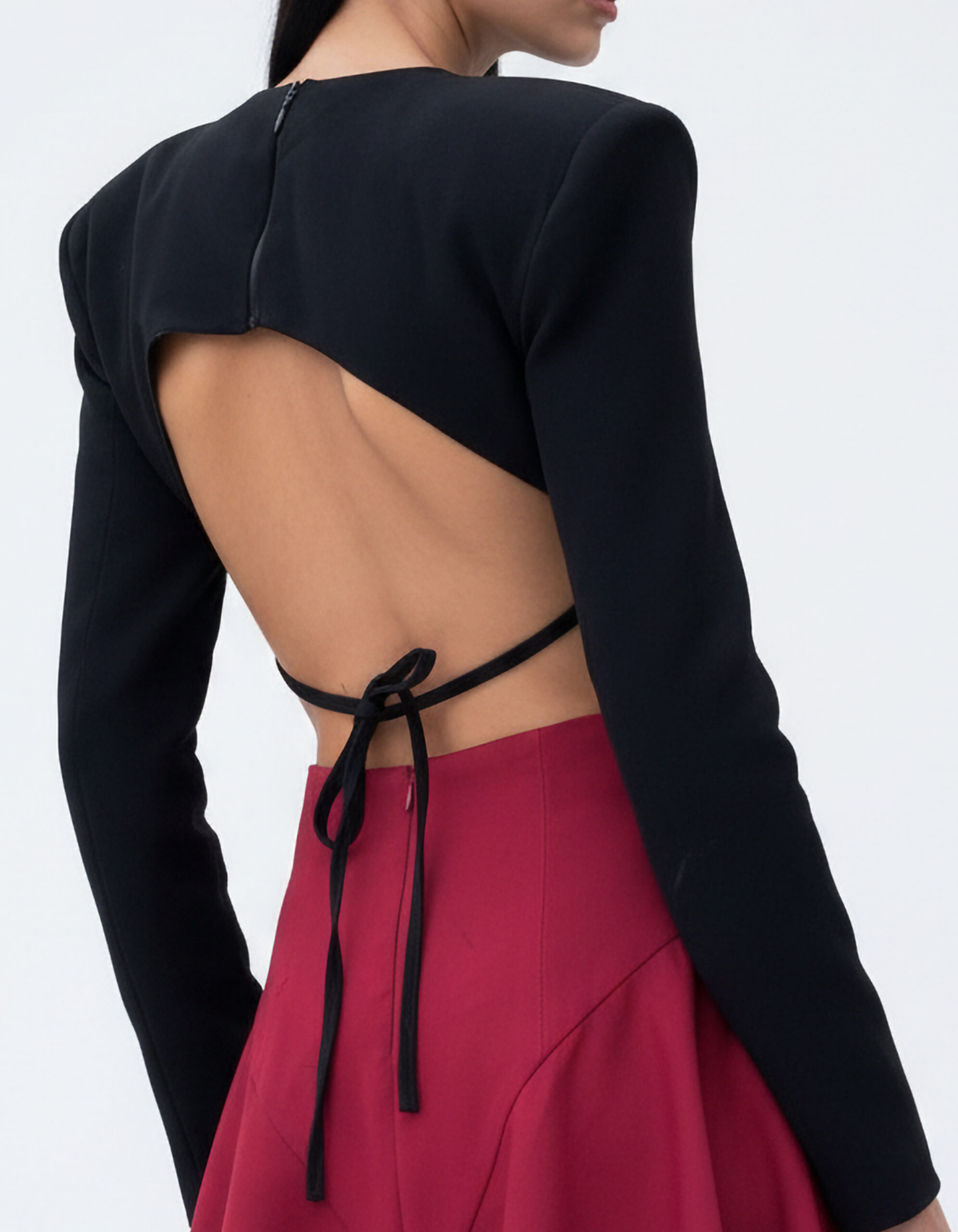 fitted front, open-back with tie strapsFeatures: Padded shoulders, long sleeves, minimal clean front, Back zipper
