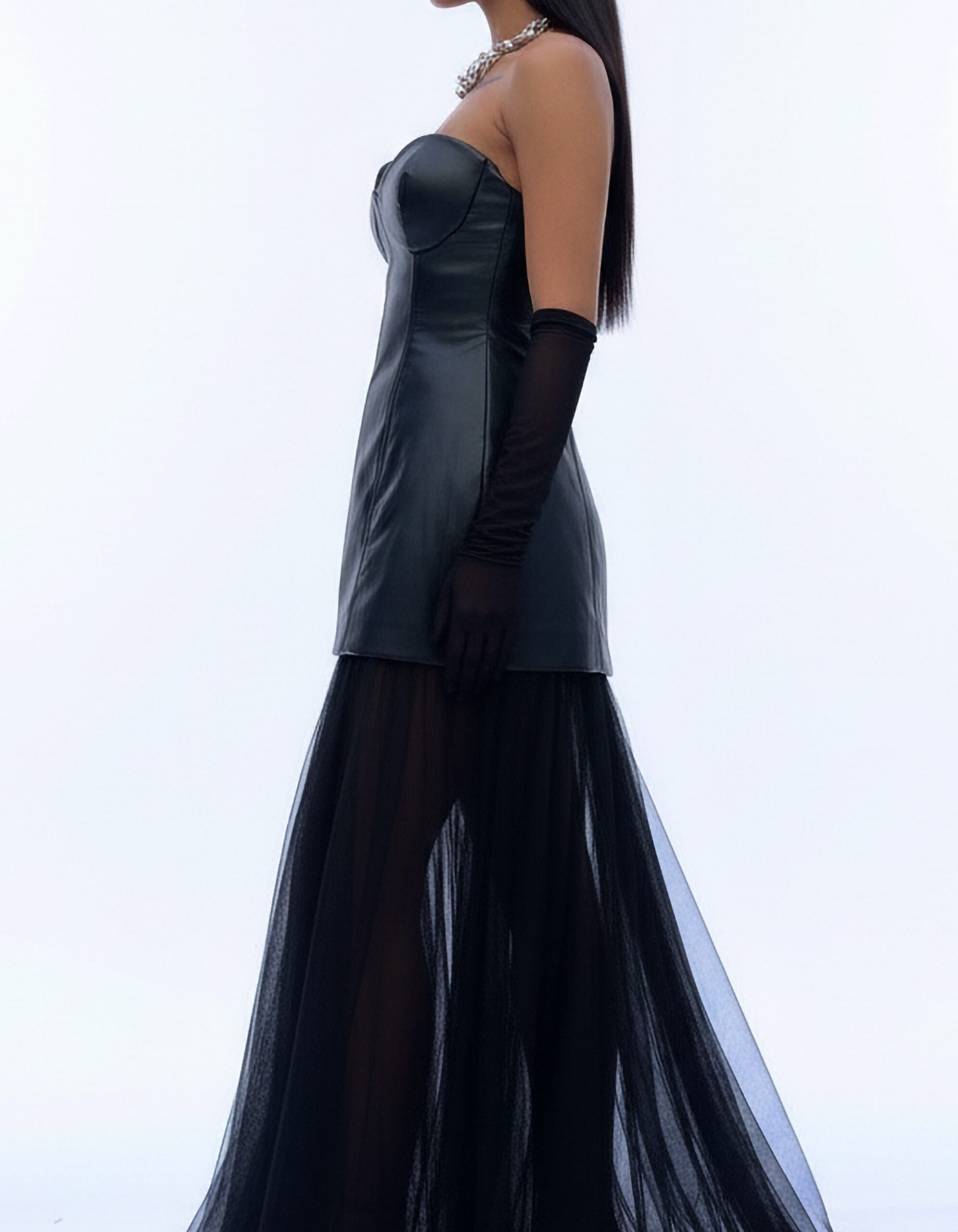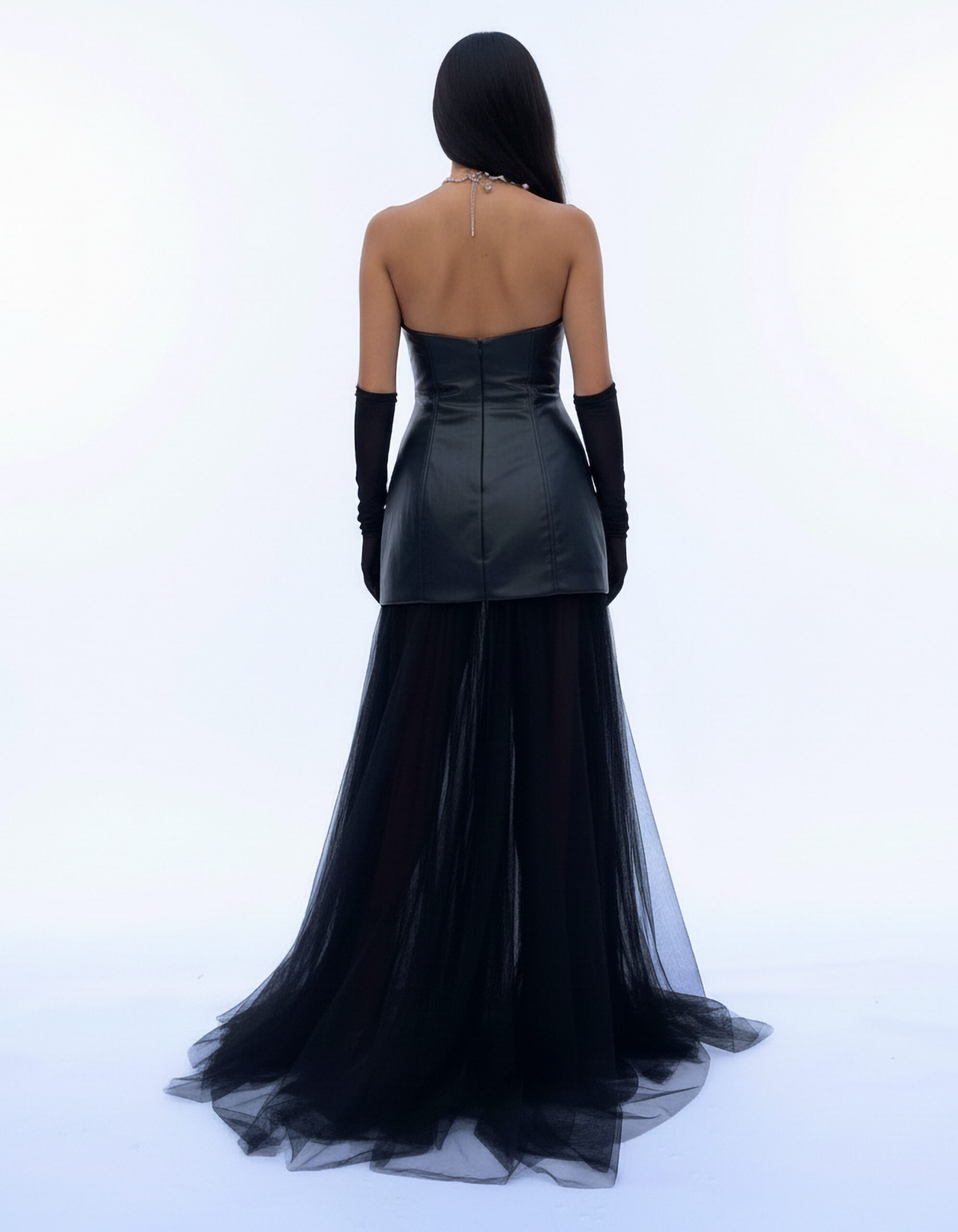 The structured leather bodice offers a sculpted, confident silhouette with a defined waistline and a secure back zipper closure. When layered with the multi-layered tulle skirt, the look transforms into a flowing, voluminous statement piece with striking contrast and dramatic motion. The deep black color amplifies its commanding nature, ensuring it’s as memorable in photographs as it is in person.